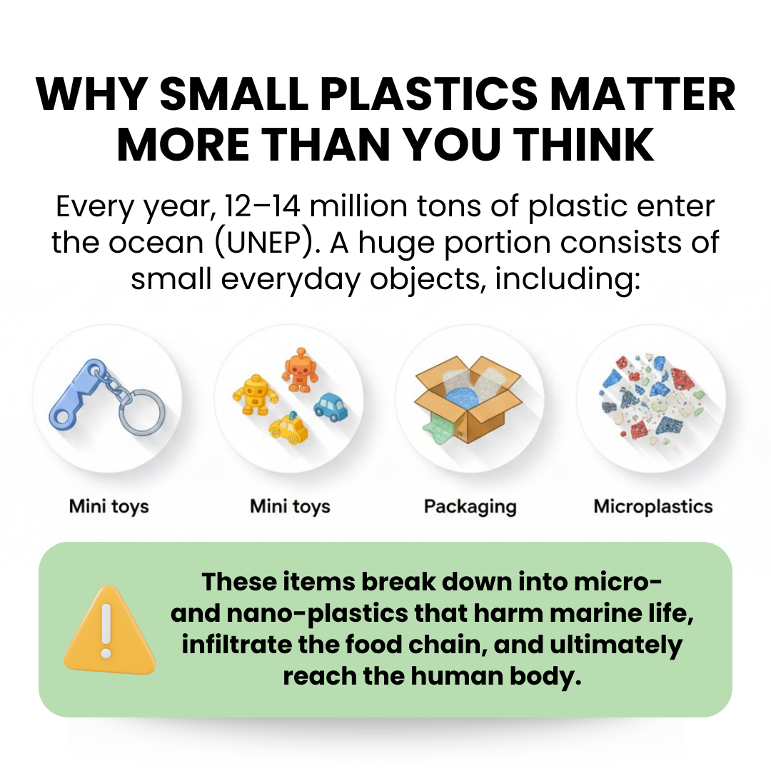 Traditional plastic products, including toys, trinkets and keychains, end up polluting our land, water, and future.